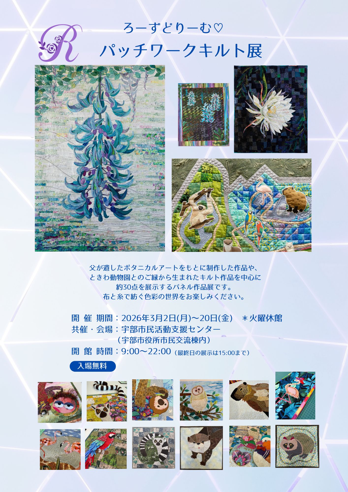 を始めとして、ときわ動物園のマップや飼育員さんが描いた動物をキルトに表現した作品など、30点をパネル展示します。